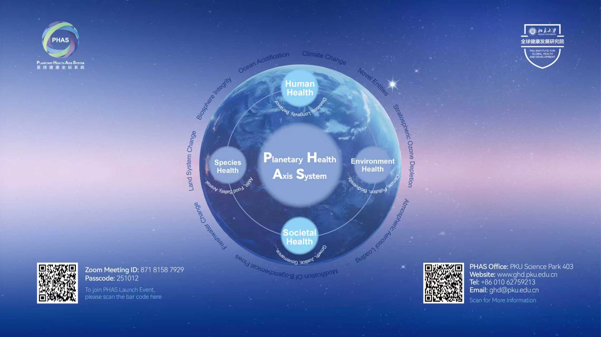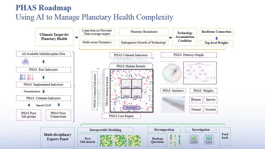 2023年10月以来,北京大学全球健康发展研究院携手来自中外数十家顶尖科研院所的科学家,牵头构建了世界首个星球健康人工智能大模型:PHAS工程。PHAS工程通过集成人类健康、物种健康、环境健康与社会健康四大坐标的48000多个关键变量,旨在动态追踪与评估人类发展足迹、其他物种演进、自然环境变化与广义星球边界关系的全景式进程。