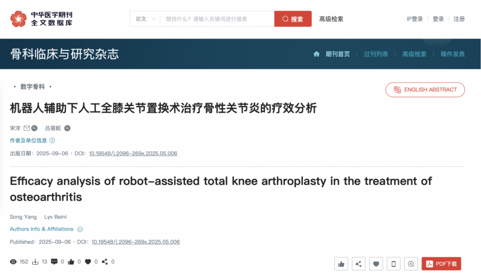 平行研究成果示例:学术论文《机器人辅助下人工全膝关节置换术治疗骨性关节炎的疗效分析》